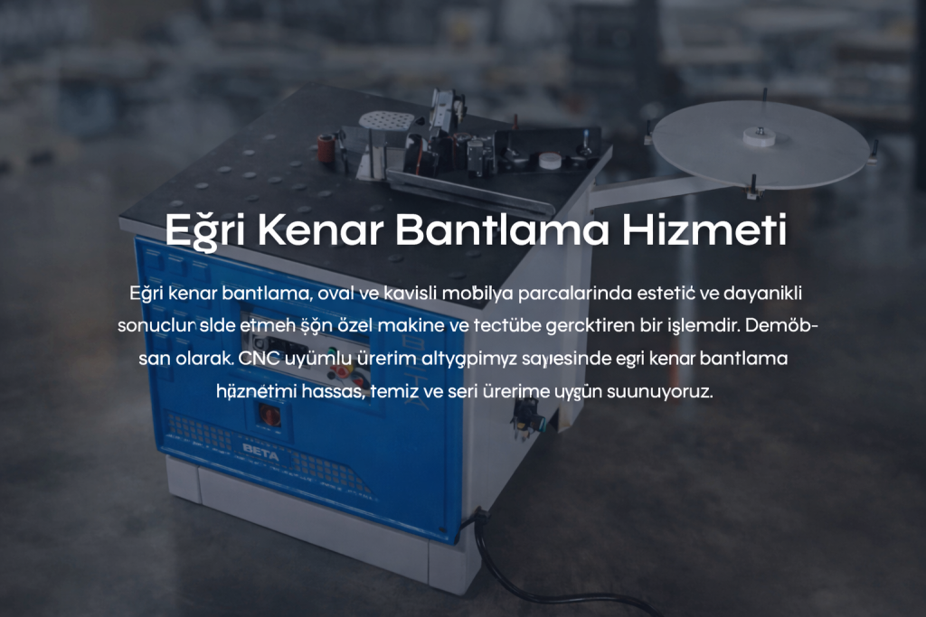 Eğri kenar bantlama, oval ve kavisli mobilya parçalarında estetik ve dayanıklı sonuçlar elde etmek için özel makine ve tecrübe gerektiren bir işlemdir. Demobsan olarak CNC uyumlu üretim altyapımız sayesinde eğri kenar bantlama hizmetini hassas, temiz ve seri üretime uygun şekilde sunuyoruz.